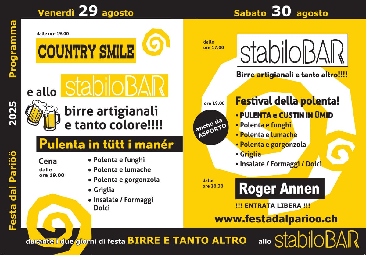 Venerdì 29 e Sabato 30 agosto 2025 per la 28ma edizione, Festa del pariöö, presso il Parco dell'Asilo di San Pietro.