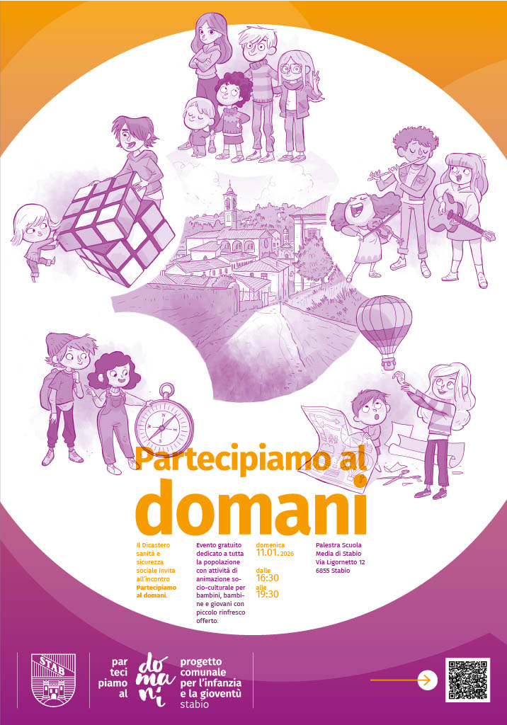 Domenica 11 gennaio 2026, dalle ore 16.30 alle 19.00, presso la Palestra della Scuola media di Stabio, si terrà la presentazione del progetto "Partecipiamo al domani. Progetto comunale per l'infanzia e la gioventù di Stabio", organizzata dal Dicastero Sicurezza sociale.
