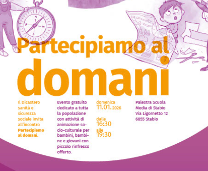 Il Municipio di Stabio invita all’evento di presentazione del progetto “Partecipiamo al domani” che si terrà domenica 11 gennaio 2026 dalle ore 16.30 alle ore 19.30 presso la palestra della Scuola media di Stabio.